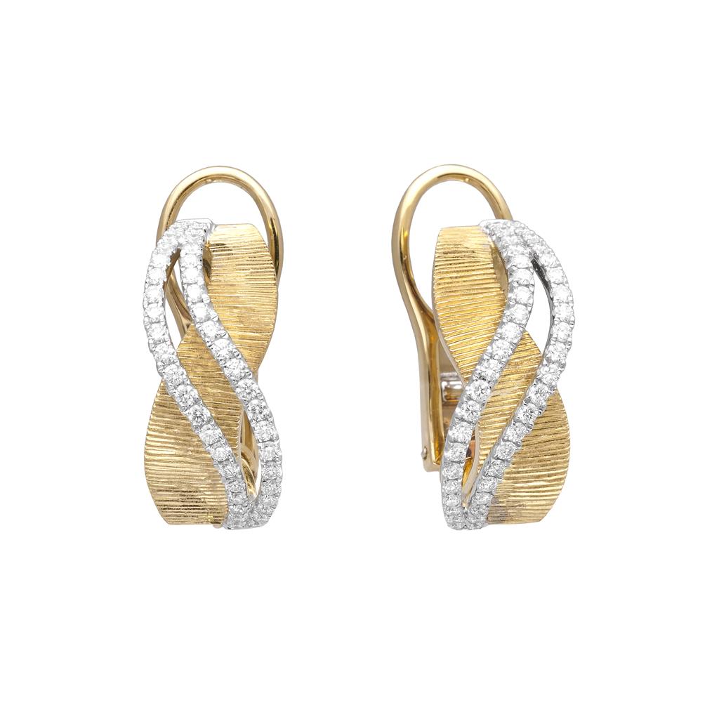 Exquisite 18K two-tone curved lever back earrings featuring .68 carat total weight of round brilliant cut diamonds. Hand-engraved craftsmanship with two elegant rows of 82 shimmering diamonds. Available at Parker Jewelers, your trusted family-owned jeweler in Carlisle, PA.