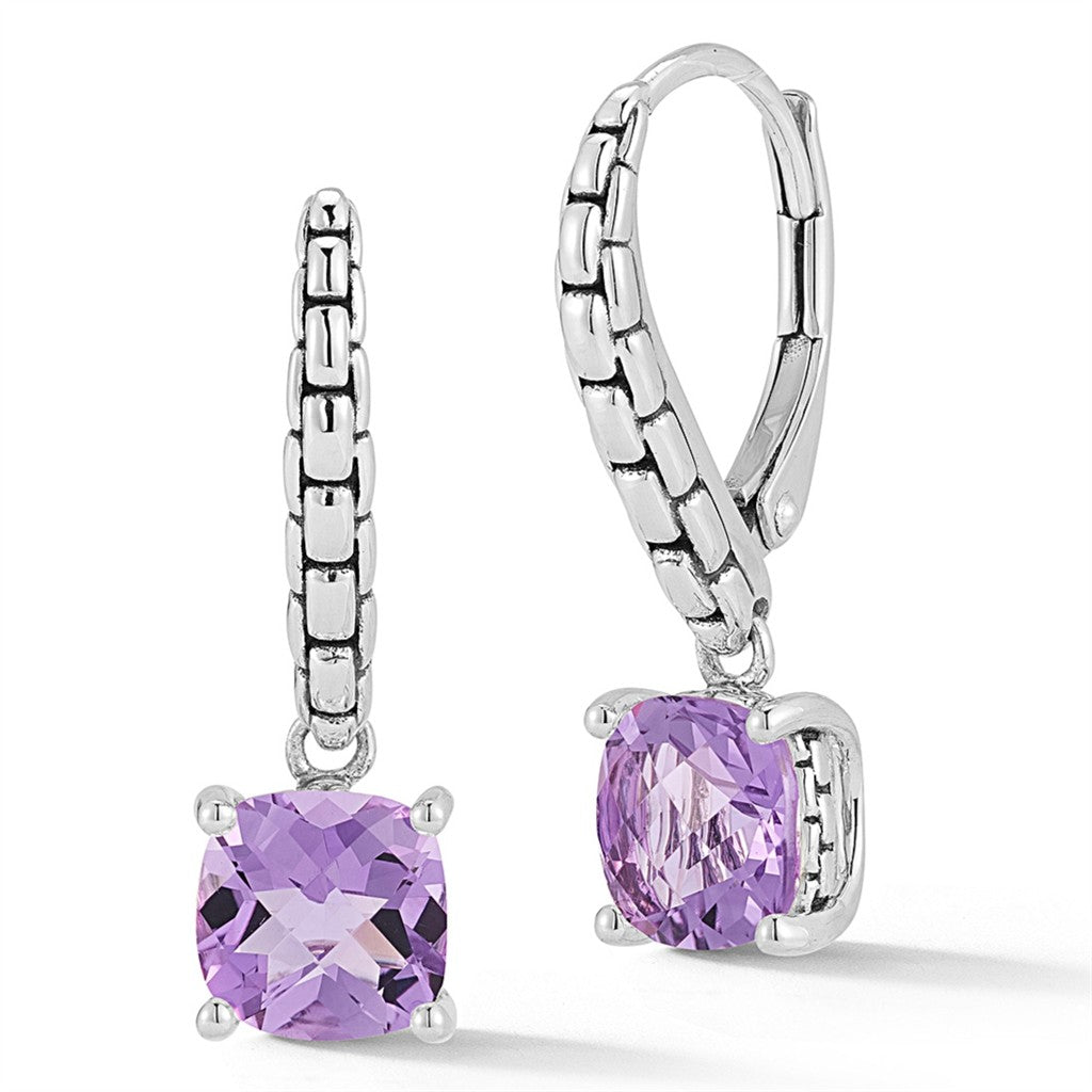JAI Sterling Silver Box Chain Pattern Lever Back Drop Earrings with Amethyst