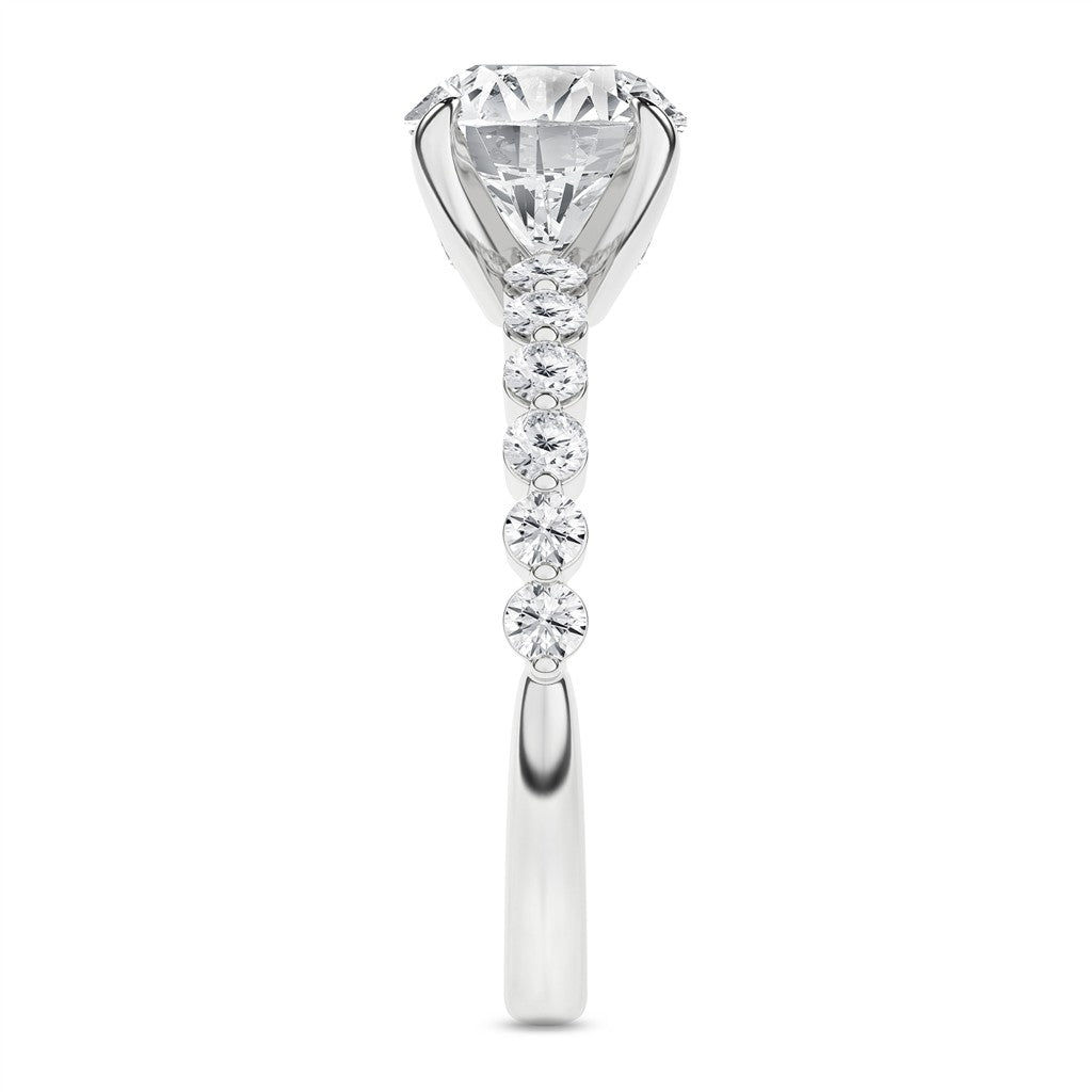 LGD 1.97CTW 14KWG ENGAGEMENT RING 1.50CT ROUND LAB GROWN DIAMOND CENTER F VS, 4 PRONG SET14 ROUND LAB GROWN DIAMONDS ON SHARED PRONG SET ON SHOULDERS AND SUPRISE LG DIAMOND ON FRON AND BACK OF HEAD E-F VS FINGER SIZE 7