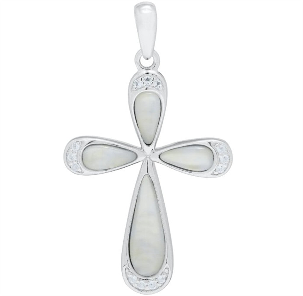 Sterling Silver Cross Necklace with Mother of Pearl & White Topaz – 18" Chain